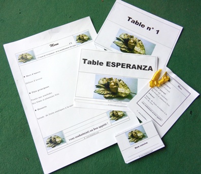 Chacun de ces Packs inclut divers éléments imprimables : Cartons de tables, grands et petits menus, marque-places ... avec le même logo décoratif exotique (ici logo avec noix de coco décorative).